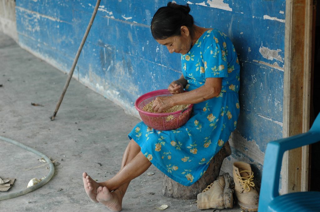 Nach einer dichten Besiedelung durch die Maya folgte nach 900 AD eine jahrhundertelange Menschenleere in der Region. Mitte des 20. Jahrhunderts kamen erste „Chicleros“ in die verlassene Gegend, um in den Wäldern Kautschuk vom Breiapfelbaum (Manilkara Zapota) zu ernten. Ab den 1970er Jahren wurden Landlose aus ganz Mexiko, manchesmal ganze Dörfer, hier angesiedelt. Deshalb leben heute besonders viele Menschen unterschiedlicher Ethnie und Herkunft in Calakmul. Im Bild wird Mais gereinigt und für die Herstellung von Tortillas vorbereitet.