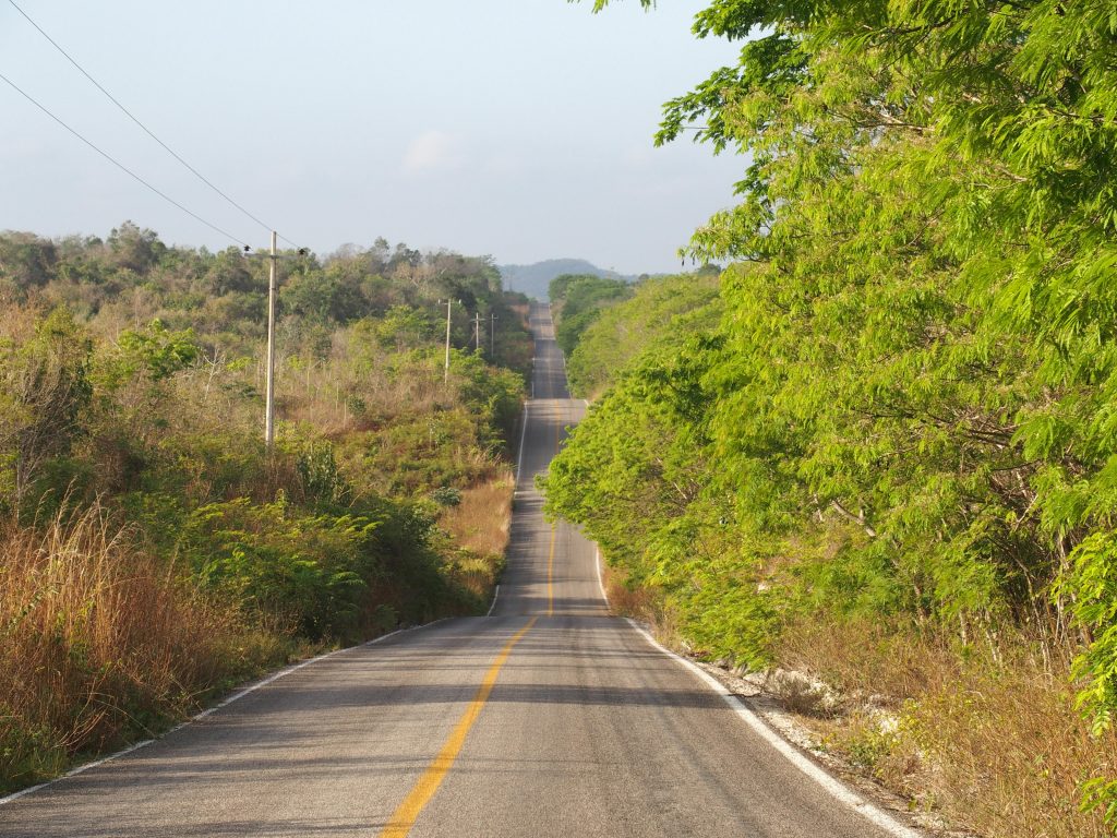 Die Straßen wurden strategisch durch das enorme Waldgebiet angelegt und gehen nicht selten 15 kilometer geradeaus. Die leicht hügelige Landschaft weist einen „halbhohen, feuchtgrünen Tropenwald“ (Selva mediana subcaducifolia) auf, was bedeutet, dass ein Teil der Bäume in der Trockenzeit die Blätter abwirft. Je südlicher man in Richtung Petén, Guatemala kommt, desto höher und immergrüner wird der Wald. Die Straßen sind oft in einem unfassbar miserablen Zustand, sodass man sich für eine Strecke von 30 km über zwei Stunden an Schlaglöchern vorbeischummeln muss. Fahren ist in dieser Gegend immer ein Erlebnis, aber die Abenteuer mit „baches“ und „topes“ sind eine andere Geschichte …